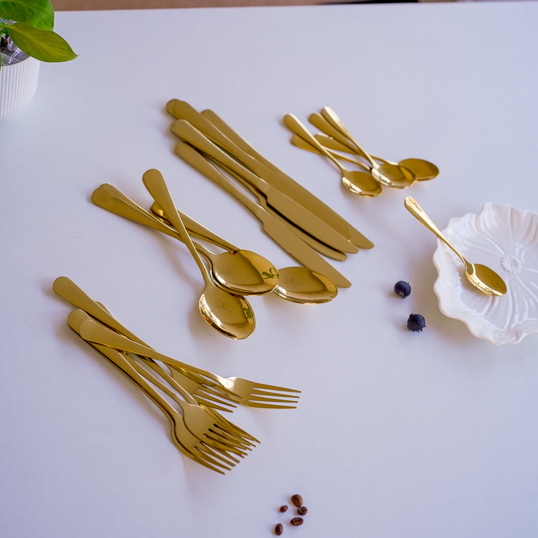 - Elevate your dining experience with our Golden Elegance 24-piece cutlery set, crafted from 401 grade high-quality stainless steel with a lustrous gold PVD finish.