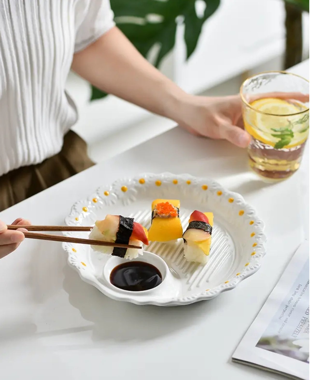 - Elevate your entertaining experience with our Elegant Daisy Delight Ceramic Chip & Dip Plate. Immerse your gatherings in sophistication with this luxurious 9-inch serving platter featuring a pristine white backdrop adorned with charming yellow daisy flower designs.