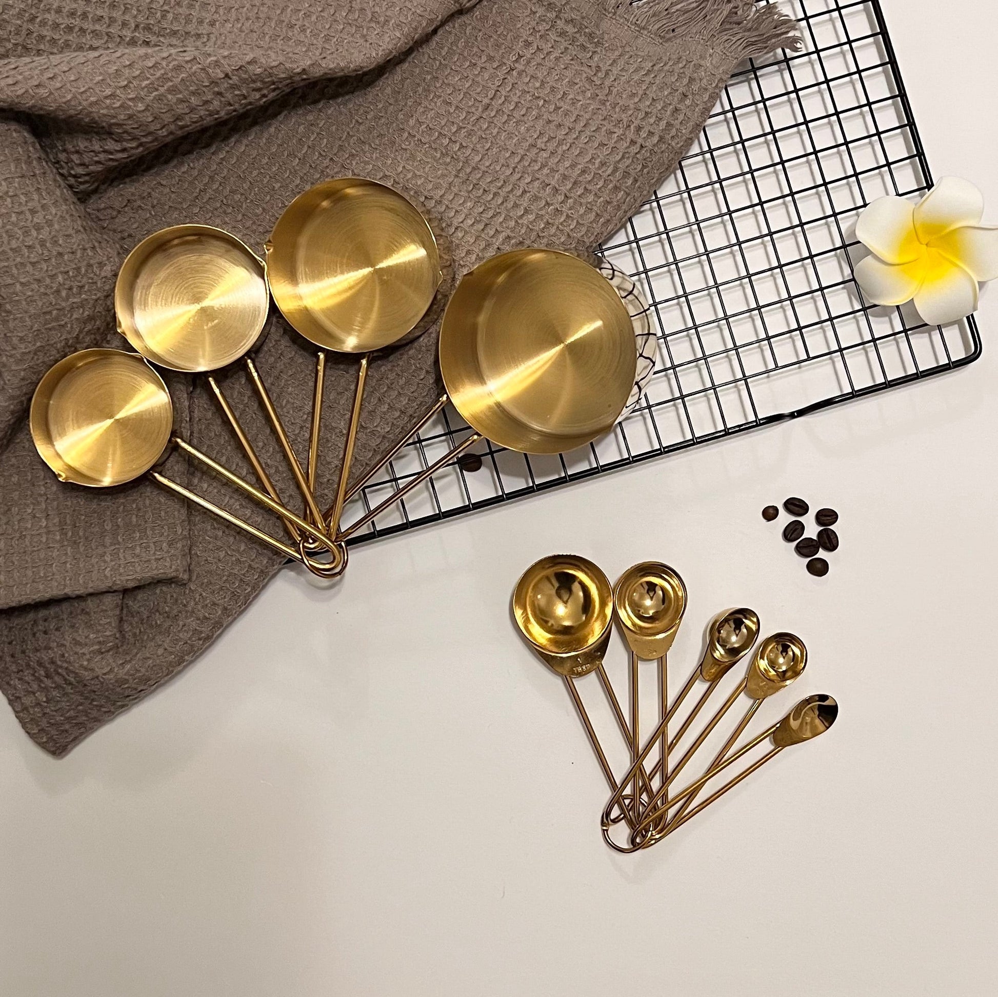 - These golden measuring cups and spoons add elegance to your kitchen decor while being one of the important kitchen tools and Baking essentials.